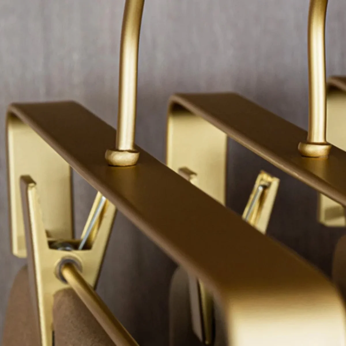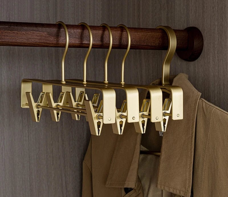Lot de 5 cintres en aluminium avec deux pinces mobiles antidérapantes. Élégance et luxe pour organiser vos pantalons et jupes sans les abîmer.