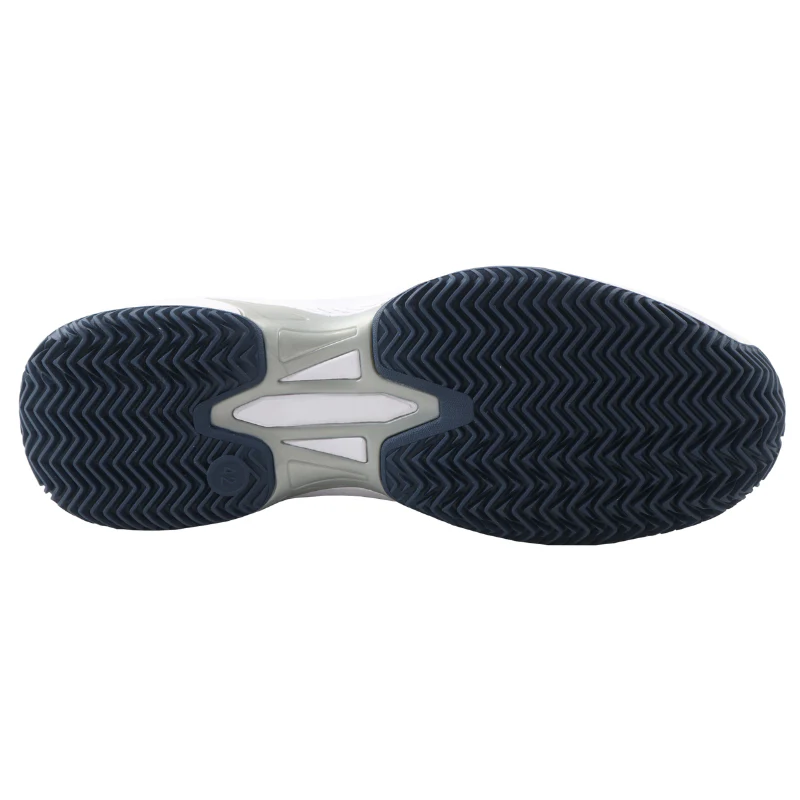 De couleur blanche avec des détails bleu marine, ces chaussures sont spécialement pensées pour le padel, avec une semelle Clay adaptée aux surfaces glissantes.