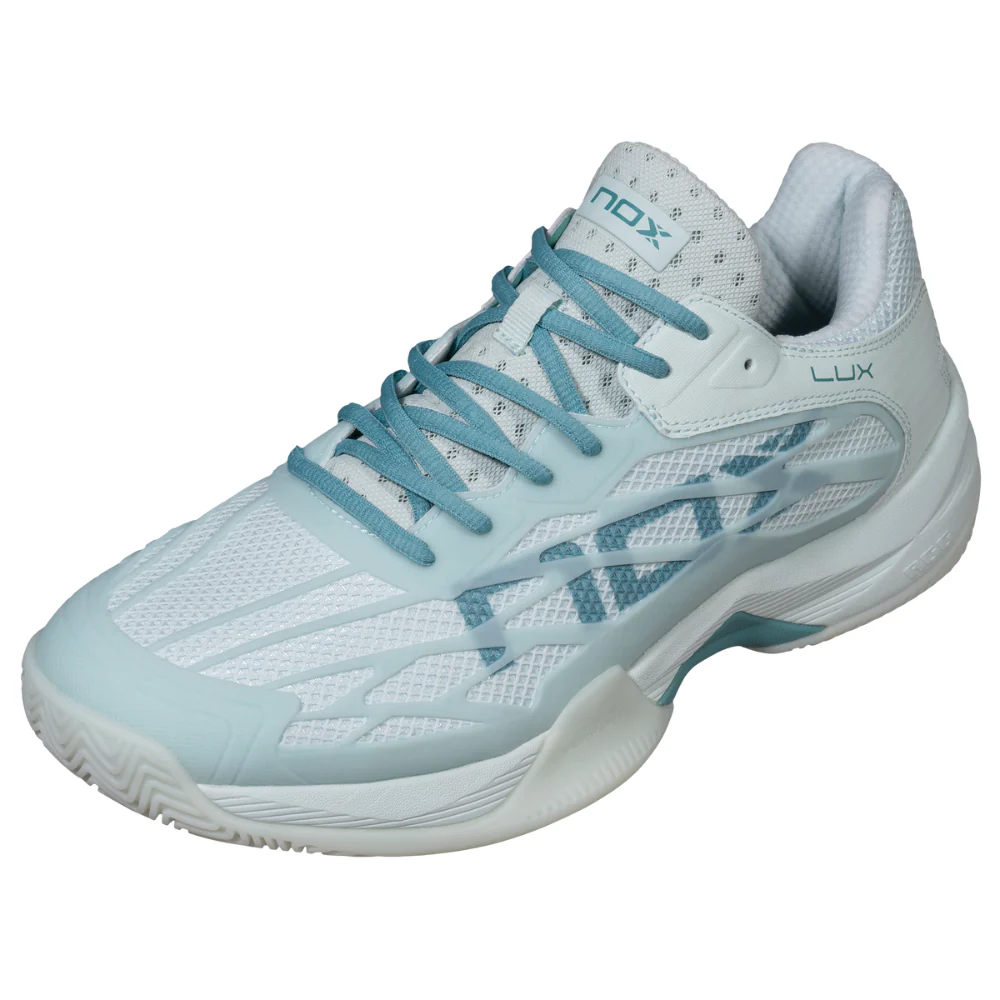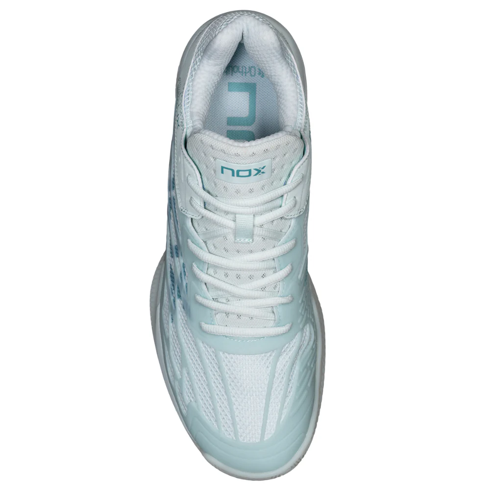 Nox dévoile les nouvelles chaussures de padel Femme AT10 Lux Bleu, une version présentée dans un bleu clair élégant rehaussé de touches de bleu plus foncé pour un rendu à la fois moderne et raffiné.
