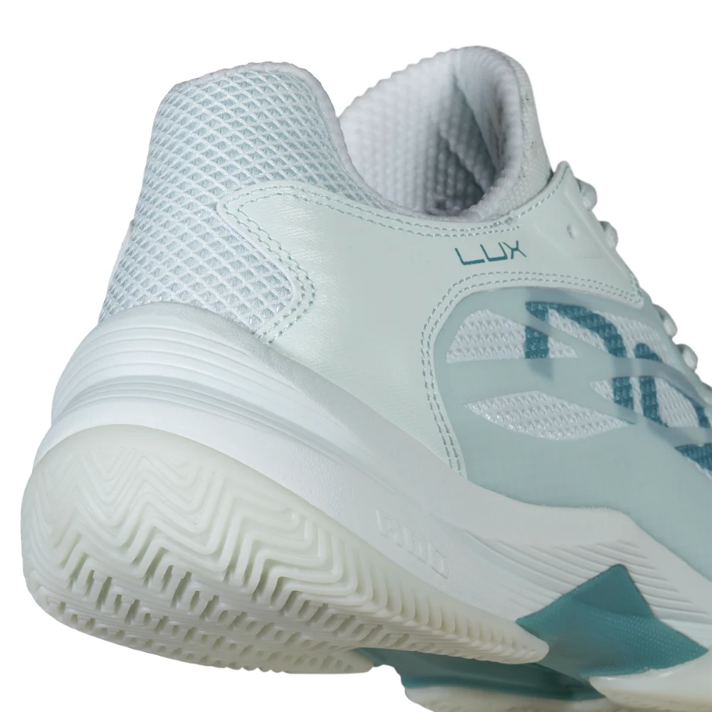 Enfin, la semelle extérieure tout-terrain, mêlant chevrons et crampons, garantit une adhérence efficace sur toutes les surfaces de padel, permettant à chaque joueuse d’évoluer en confiance, quel que soit le rythme de jeu.