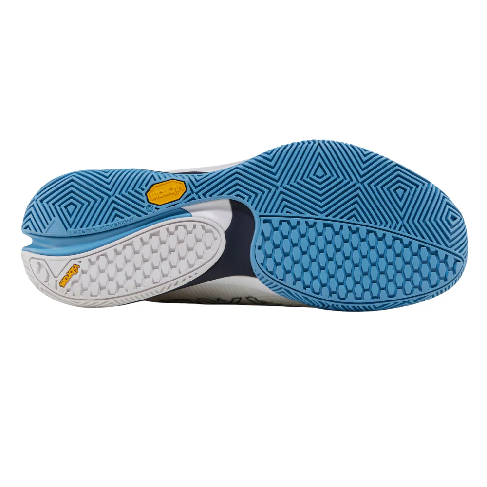 La chaussure s’appuie sur une semelle extérieure Vibram, reconnue pour sa résistance et sa fiabilité, garantissant une adhérence constante et une longévité remarquable sur les surfaces de padel.