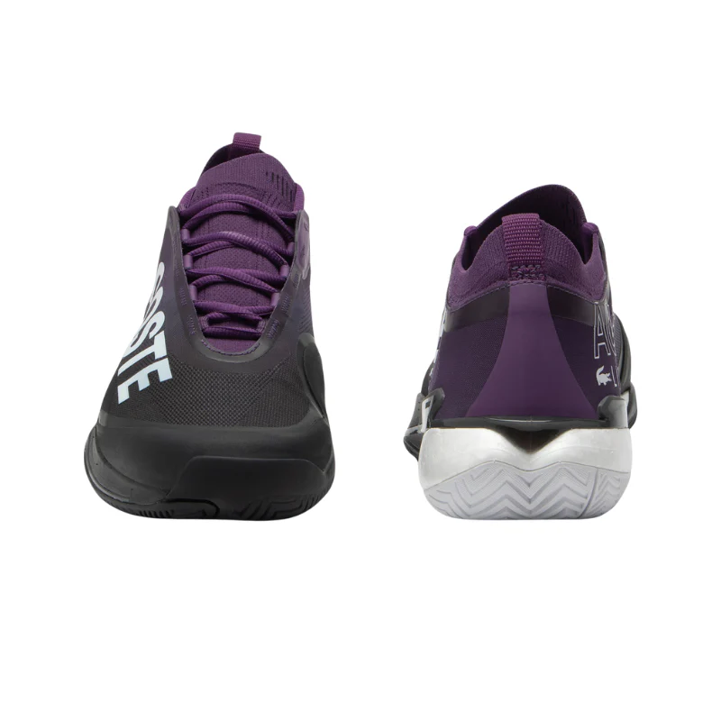 Leur design sophistiqué est sublimé par une teinte violette qui se dégrade vers l’avant de la chaussure, tandis que le logo Lacoste inscrit en grand sur le côté affiche une identité visuelle puissante et moderne.