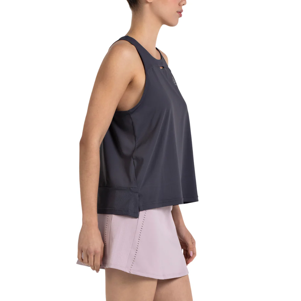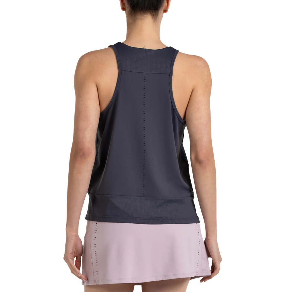 Le débardeur se distingue par une découpe sur la partie inférieure du dos et par des zones ventilées à l’avant et au dos, obtenues grâce à un embossage thermique et des perforations.