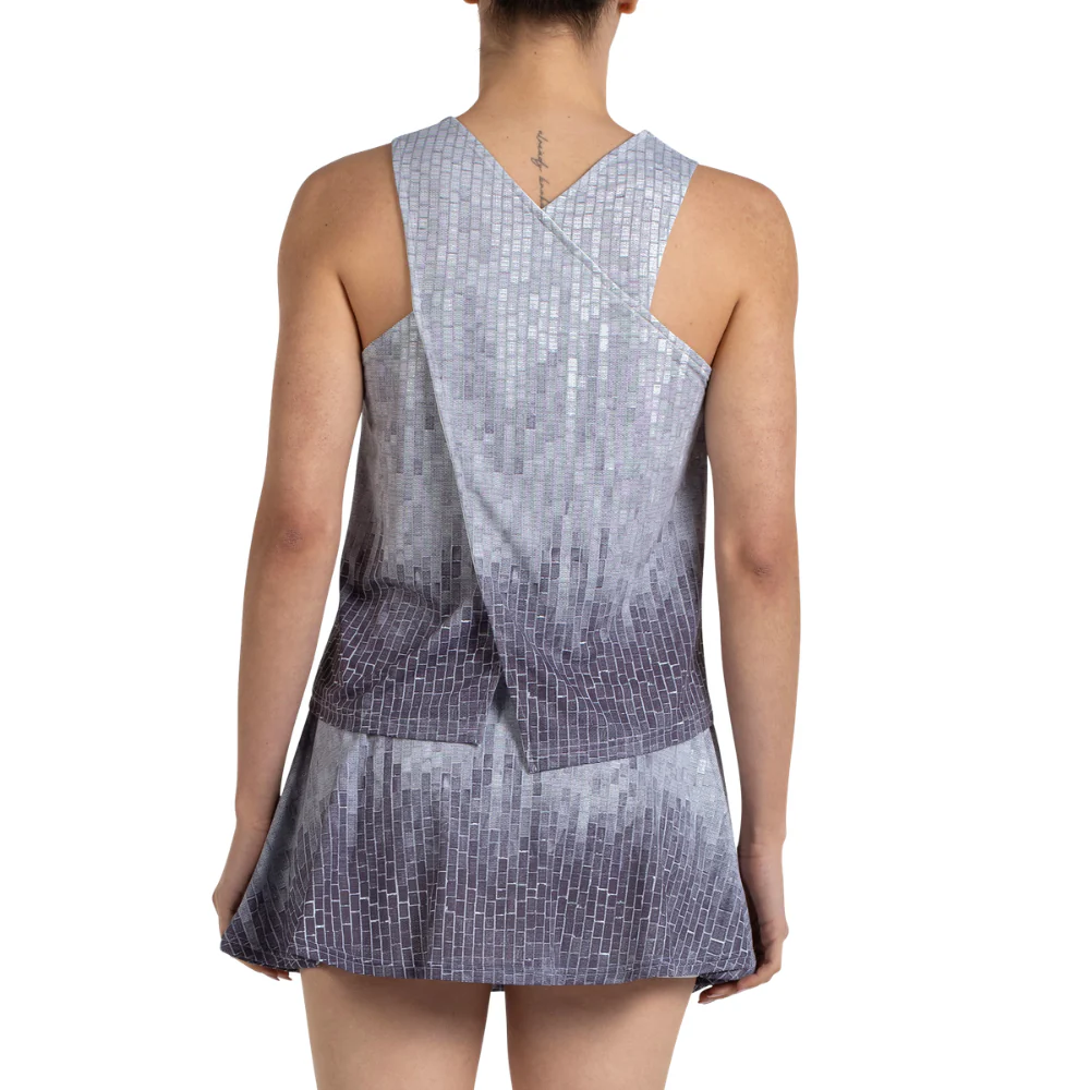 Le débardeur reprend le motif fantasy en nuances de gris, similaire à celui de la jupe Omani, apportant une touche élégante et moderne au look.