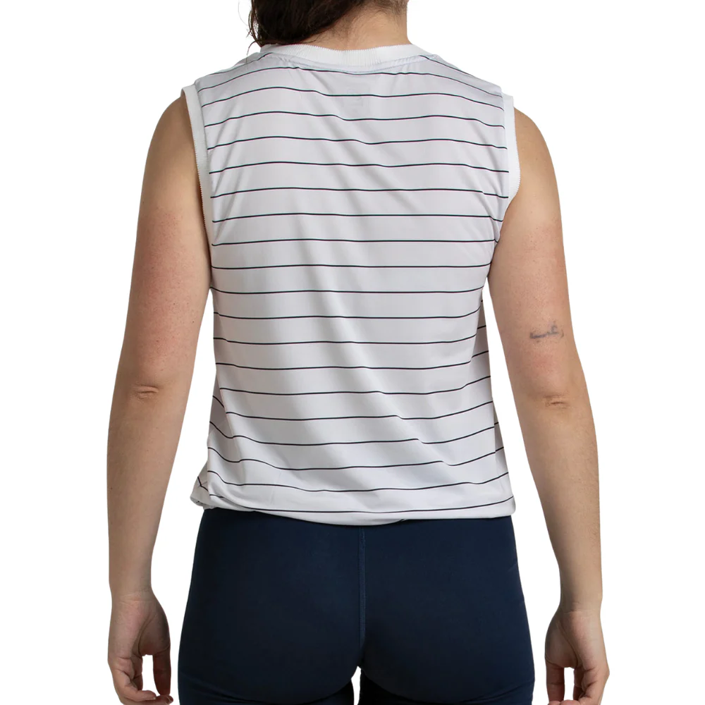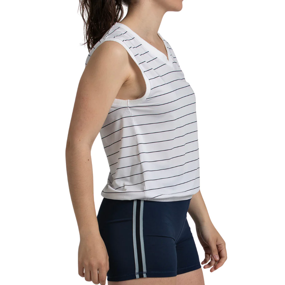 Sa base blanche, rehaussée de fines rayures bleu marine, apporte un style sportif et élégant, facile à associer avec différentes tenues de jeu.
