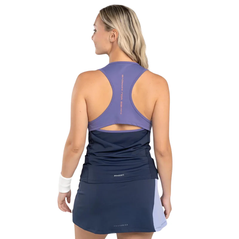 Majoritairement bleu marine, ce haut se distingue par une partie du dos qui arbore une couleur violet lilas.