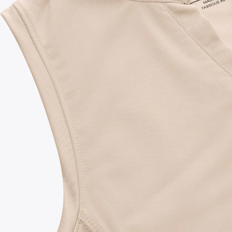 Sa coupe ajustée, ses bretelles fines et son col en V légèrement montant offrent une liberté de mouvement optimale. Sa teinte beige intemporelle apporte une touche de sobriété et d’élégance à votre tenue sportive.