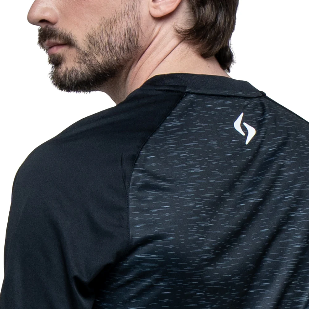 Entièrement noir, il se distingue par un imprimé graphique discret à l’avant et au dos, tandis que les manches restent unies pour un look élégant et moderne.