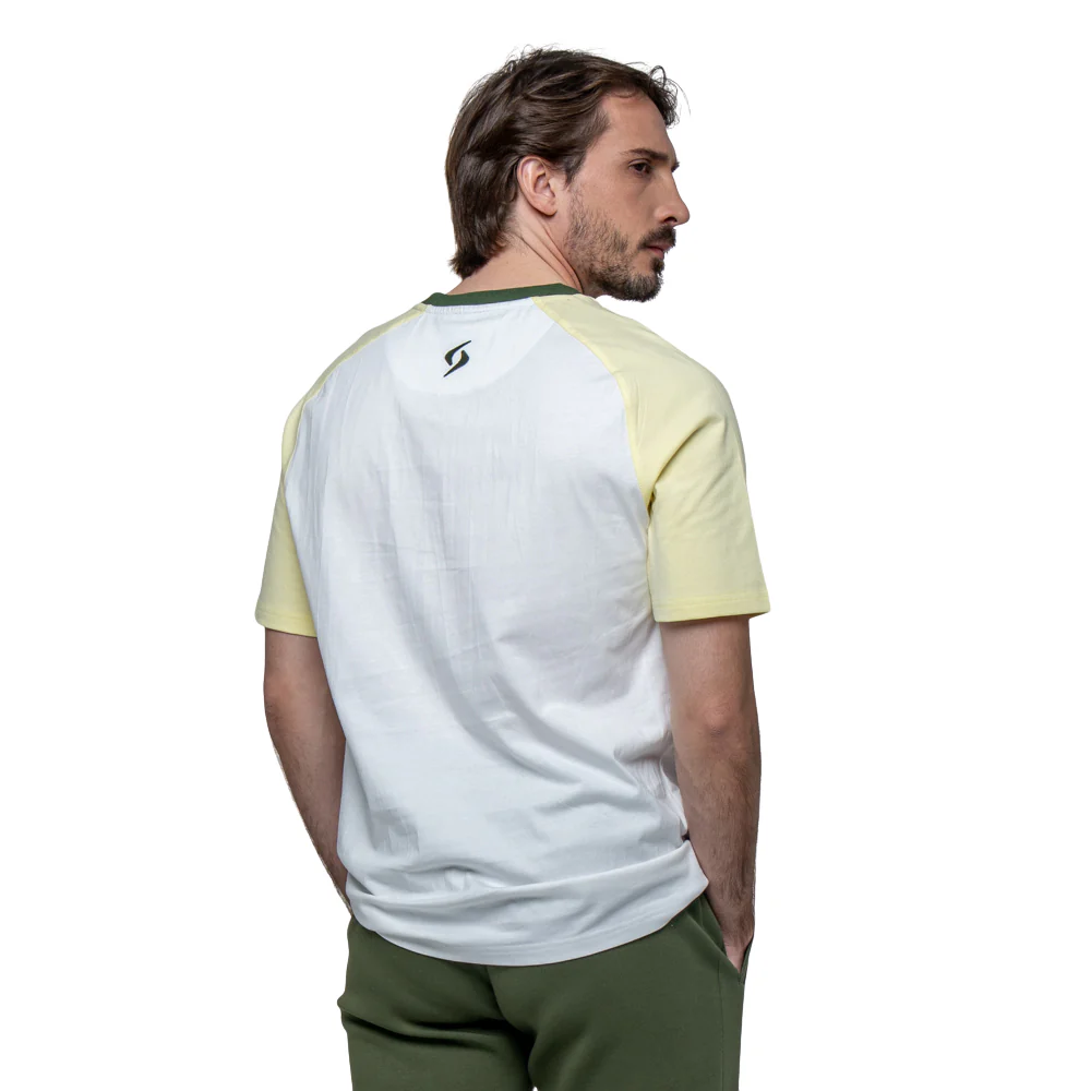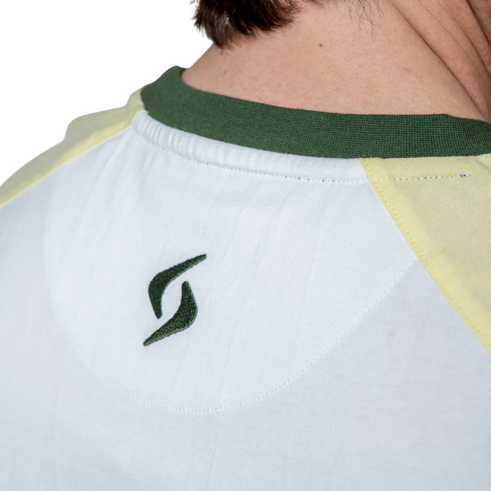 Son design se distingue par un buste blanc contrasté par des manches jaunes et un col rond vert.
