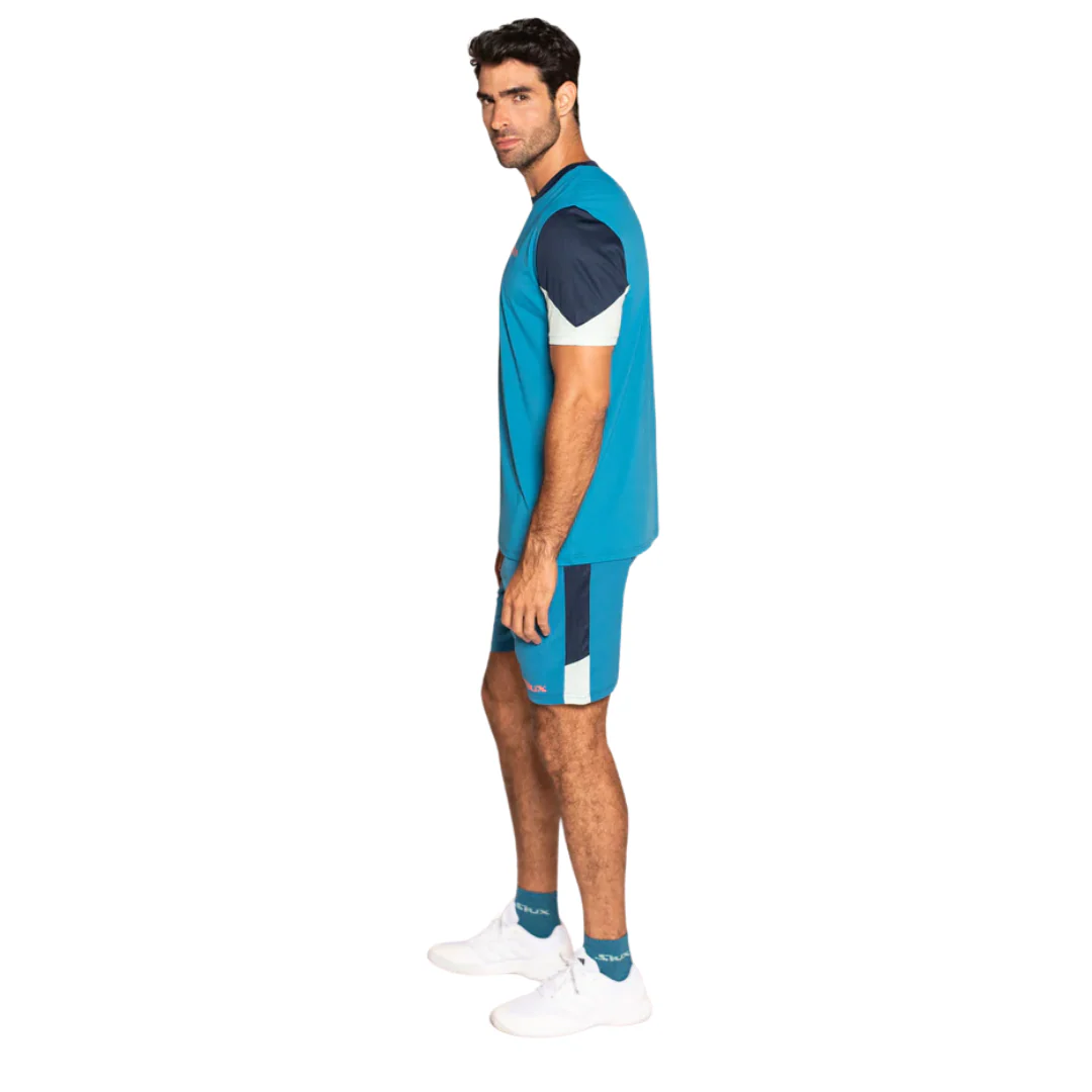 Son design bicolore bleu aux manches contrastantes apporte une touche de modernité tout en offrant une grande liberté de mouvement.